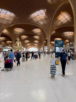 On est finalement tous prêt, mais ça nous a mis en retard pour le départ. On se dépêche de trouver un taxi pour l'aéroport. Bouchon de circulation, Delphine qui a mal au coeur en voiture... On arrive finalement à l'aéroport gigantesque de Phnom Penh. Je fais la file pendant 30 minutes au mauvais comptoir de notre ligne aérienne... Je change de ligne et on doit attendre encore une heure de plus avant de déposer les bagages. On court des kilomètres, à la sécurité, aux douanes et à l'immigration et on se rend de justesse à notre vol. Cet aéroport est vraiment beaucoup trop grand pour rien!