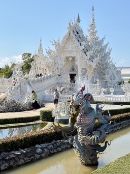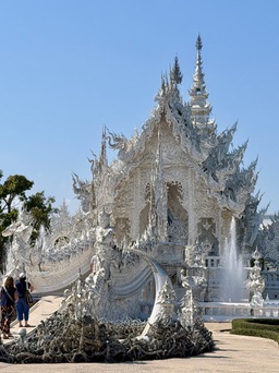 Après le nord de la Thaïlande, nous voici au Laos. Nous avons quitté Chiang Mai vers la frontière laotienne, plus au nord, en minibus pour une ballade de 5h dans la campagne. Routes sinueuses + chauffeur agressif + enfant qui a bu un chocolat chaud avant le départ et n'a pas pris de gravol = Hmmm... je vous épargne les détails... On s'est tout de même rendu, avec un arrêt à Chiang Rai pour manger, juste devant le spectaculaire temple blanc que nous avons pu admirer.