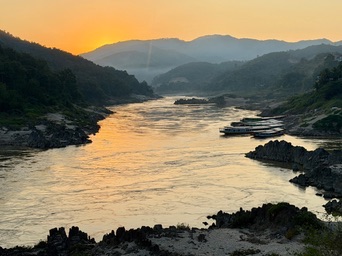 On arrive finalement au poste frontalier à Chiang Khong, côté Thaïlande, où nous réglons les formalités de sortie du pays. Puis, on monte dans un autre bus qui traverse le Mékong, une affaire de 4 minutes, pour rejoindre l'autre poste frontalier, du côté laotien afin d'obtenir notre visa, et passer l'immigration et la douane. 30 minutes plus tard, nous sommes en route pour le petit village de Houay Xai et notre hôtel, situé à 10 minutes en tuk-tuk du poste frontalier. Le village est très simple, mais joli et nous avons finalement nos premières impression du Mékong, au coucher du soleil. Une photo vaut mille mots...